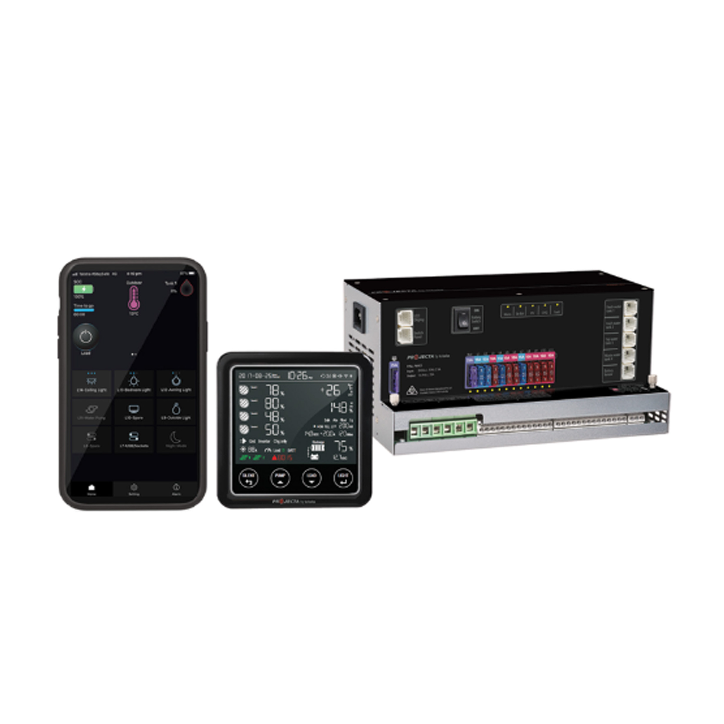 The central switch panel can be mounted anywhere and allows remote operation of water pump, lighting and appliances, plus a master switch and night mode. Bedroom lighting switch panels enable light and dimming control from the comfort of your bed. Bluetooth connectivity means you can control and monitor your power system and appliances from inside or outside using the smart phone app – great for outdoor light switching.