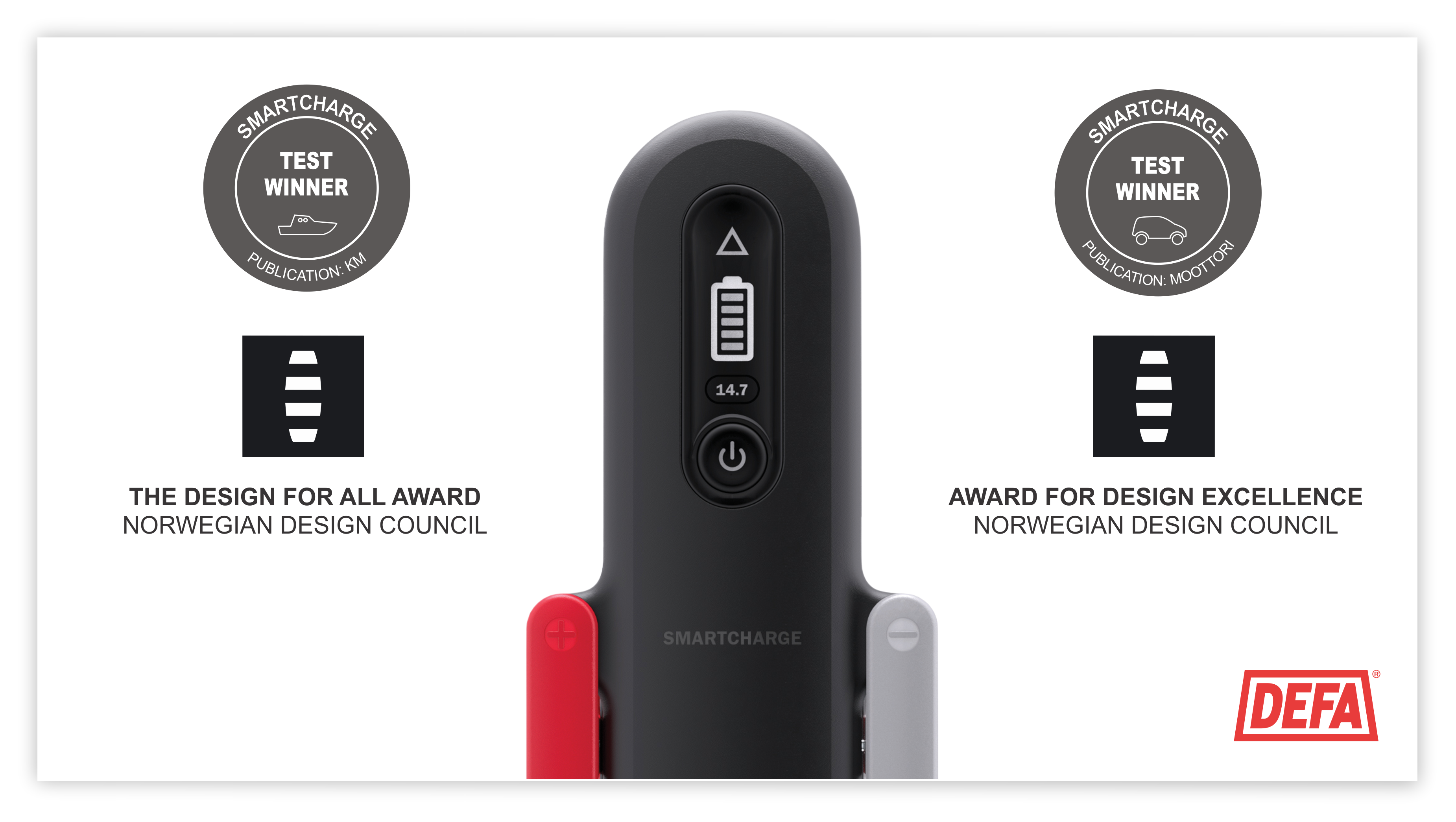 TEST AND AWARD WINS Chargers in the SmartCharge family have been crowned the best car charger by the Finnish motoring magazine Moottori, and the best boat charger in a test published in several Nordic magazines, including the Finnish KM and the Norwegian Båtmagasinet. It has also received the Award for Design Excellence and the Design for All awards from Norwegian Design Council, now DOGA. SmartCharge received top marks for combining first-class results with a user-friendly interface and that makes charging easy for all users.