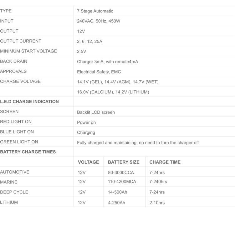 Intelli-Charge incorporates the latest technology to deliver a 7-stage charge suitable for automotive, calcium, marine and all types of deep cycle batteries (Gel and AGM). These stages of charging ensure maximum battery life and performance are delivered with a faster charging time and ensure a complete charge is achieved.